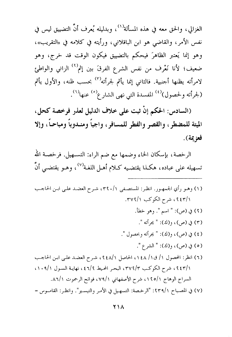 (السادس: الحكم إنْ ثبت على خلاف الدليل لعذر فرخصة كحل، الميتة للمضطر، والقصر والفطر للمسافر، واجبًا ومندوبًا ومباحًا، وإلا فعزيمة).