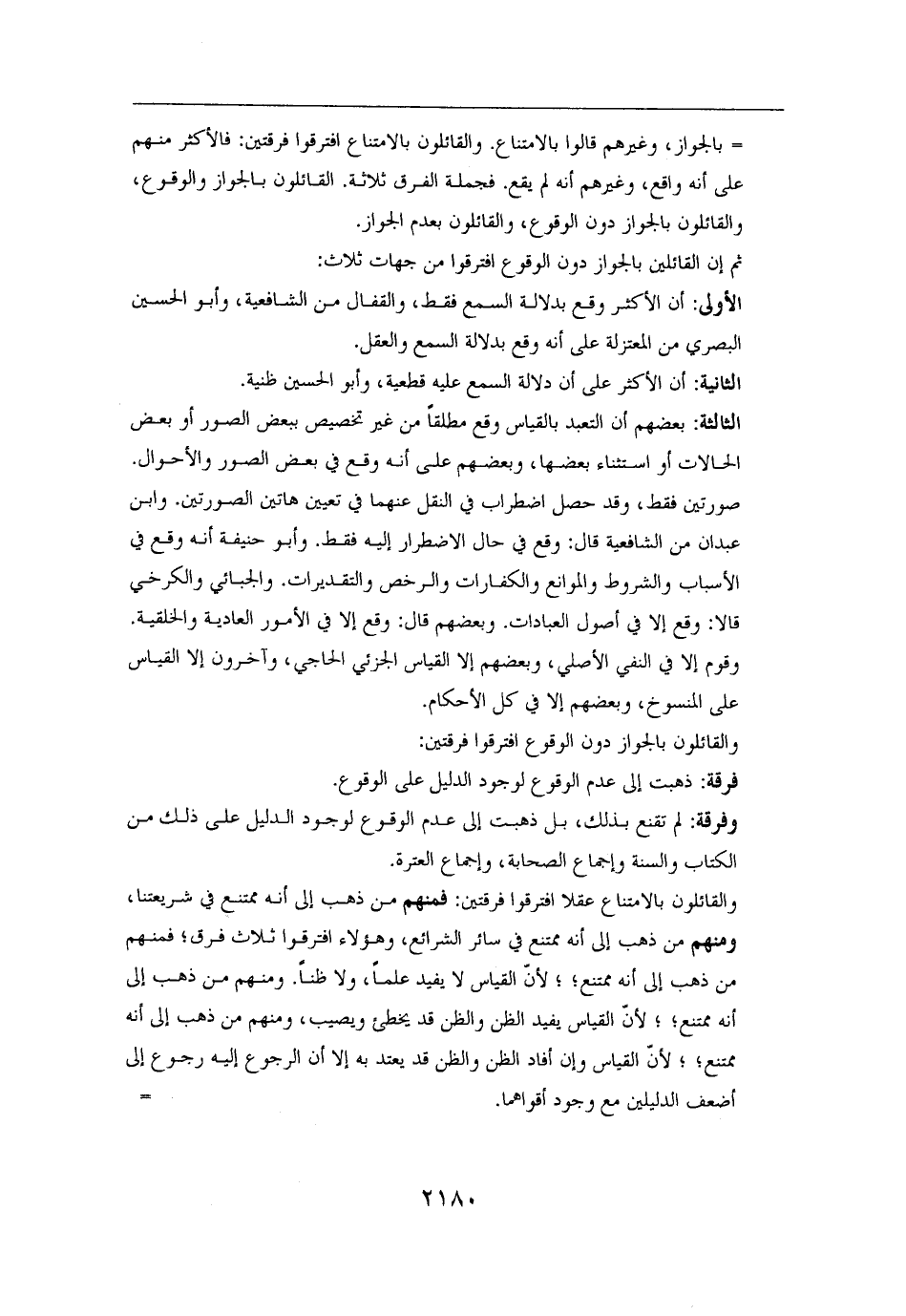 والقائلون بالامتناع عقلا افترقوا فرقتين: فمنهم من ذهب إلى أنه ممتنع في شريعتنا، ومنهم من ذهب إلى أنه ممتنع في سائر الشرائع، وهؤلاء افترقوا ثلاث فرق؛ فمنهم من ذهب إلى أنه ممتنع؛ لأنّ القياس لا يفيد علمًا، ولا ظنًا. ومنهم من ذهب إلى أنه ممتنع؛ لأنّ القياس يفيد الظن والظن قد يخطئ ويصيب، ومنهم من ذهب إلى أنه ممتنع؛ لأنّ القياس وإن أفاد الظن والظن قد يعتد به إلا أن الرجوع إليه رجوع إلى أضعف الدليلين مع وجود أقواهما. =