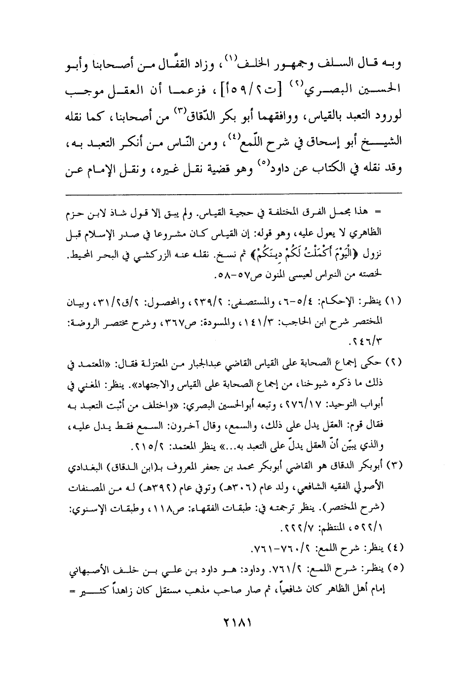 (¬٥) ينظر: شرح اللمع: ٢/ ٧٦١. وداود: هو داود بن علي بن خلف الأصبهاني إمام أهل الظاهر كان شافعيًا، ثم صار صاحب مذهب مستقل كان زاهدًا كثير =