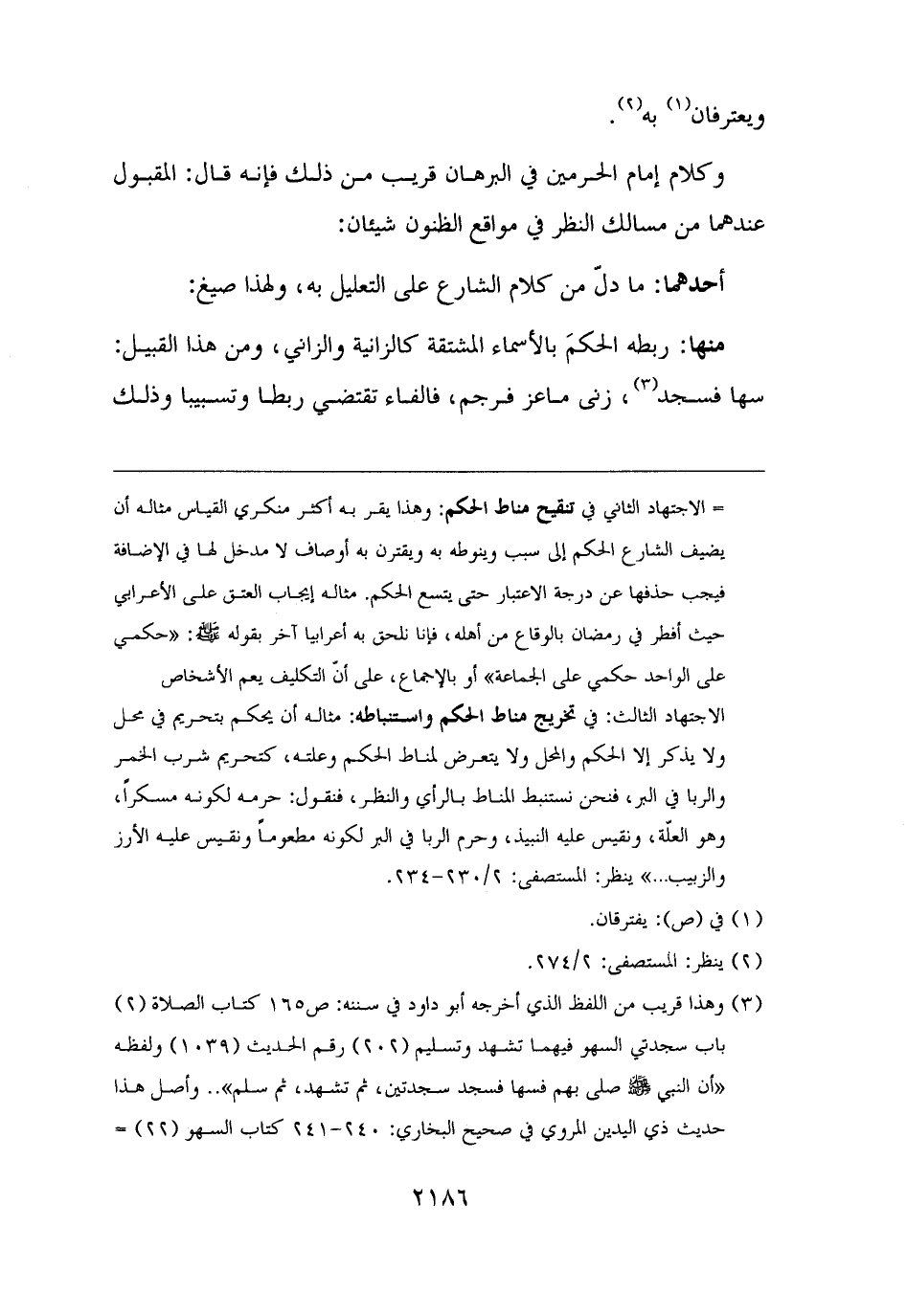 منها: ربطه الحكمَ بالأسماء المشتقة كالزانية والزاني، ومن هذا القبيل: سها فسجد (¬٣)، زنى ماعز فرجم، فالفاء تقتضي ربطا وتسبيبا وذلك