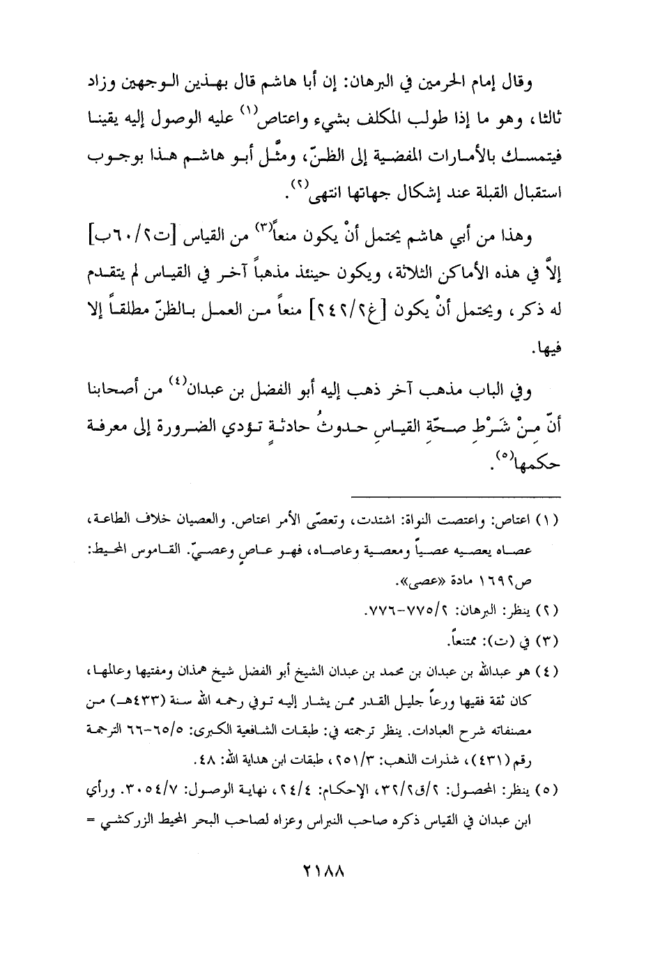 وهذا من أبي هاشم يحتمل أنْ يكون منعًا (¬٣) من القياس إلَّا في هذه الأماكن الثلاثة، ويكون حينئذ مذهبًا آخر في القياس لم يتقدم له ذكر، ويحتمل أنْ يكون منعًا من العمل بالظنّ مطلقًا إلا فيها.