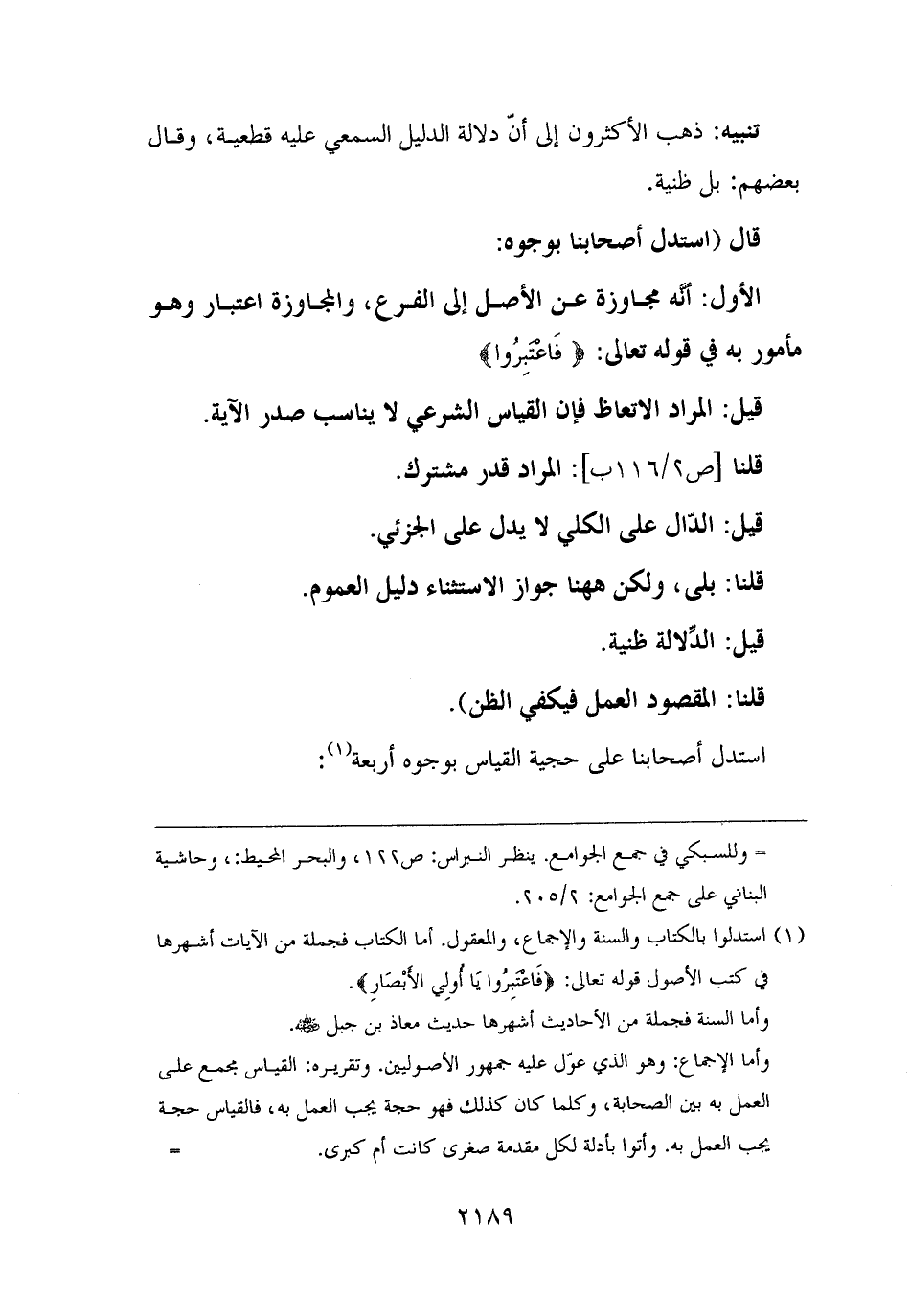 (¬١) استدلوا بالكتاب والسنة والإجماع، والمعقول. أما الكتاب فجملة من الآيات أشهرها في كتب الأصول قوله تعالى: {فَاعْتَبِرُوا يَاأُولِي الْأَبْصَارِ}.