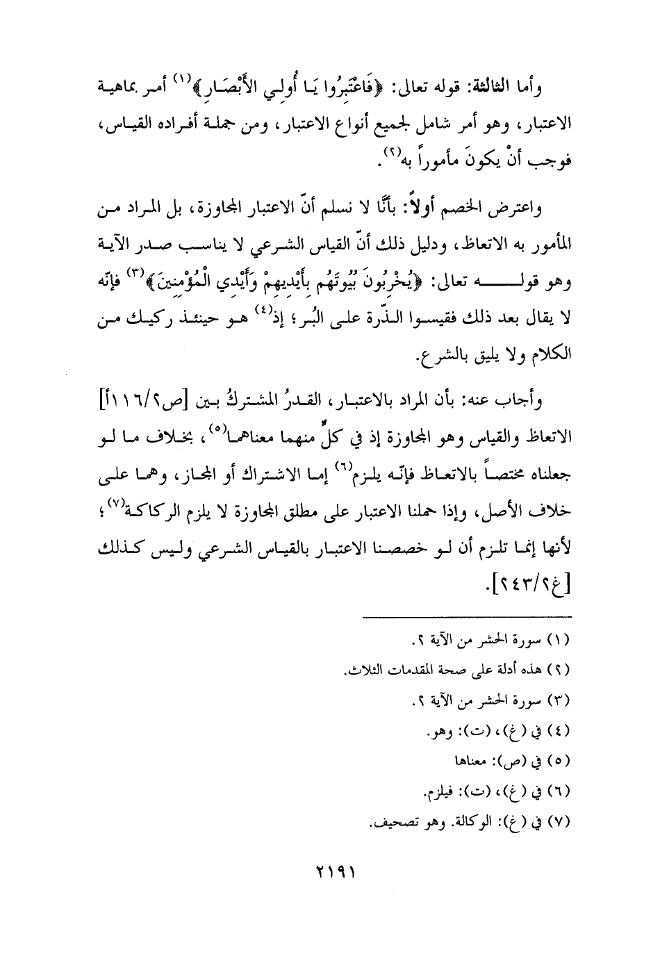 واعترض الخصم أولًا: بأنَّا لا نسلم أنّ الاعتبار المجاوزة، بل المراد من المأمور به الاتعاظ، ودليل ذلك أنّ القياس الشرعي لا يناسب صدر الآية وهو قوله تعالى: {يُخْرِبُونَ بُيُوتَهُمْ بِأَيْدِيهِمْ وَأَيْدِي الْمُؤْمِنِينَ} (¬٣) فإنّه لا يقال بعد ذلك فقيسوا الذّرة على البُر؛ إذ (¬٤) هو حينئذ ركيك من الكلام ولا يليق بالشرع.