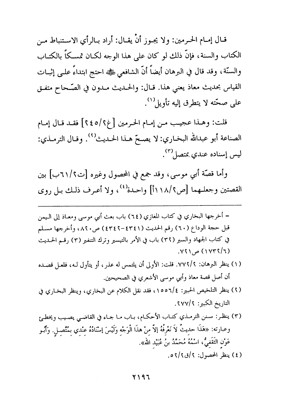 (¬١) ينظر البرهان: ٢/ ٧٧٢. قلت: الأولى أن يلتمس له عذر، أو يتأول له، فلعل قصده أن أصل قصة معاذ وأبي موسى الأشعري في الصحيحين.