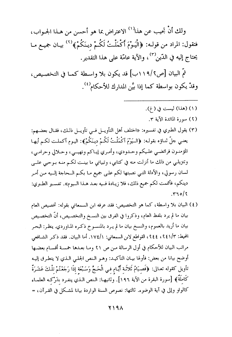 ولك أنْ تجيب عن هذا (¬١) الاعتراض بما هو أحسن من هذا الجواب، فتقول: المراد من قوله: {الْيَوْمَ أَكْمَلْتُ لَكُمْ دِينَكُمْ} (¬٢) بيان جميع ما يحتاج إليه في الدّين (¬٣)، والآية عامَّة على هذا التقدير.