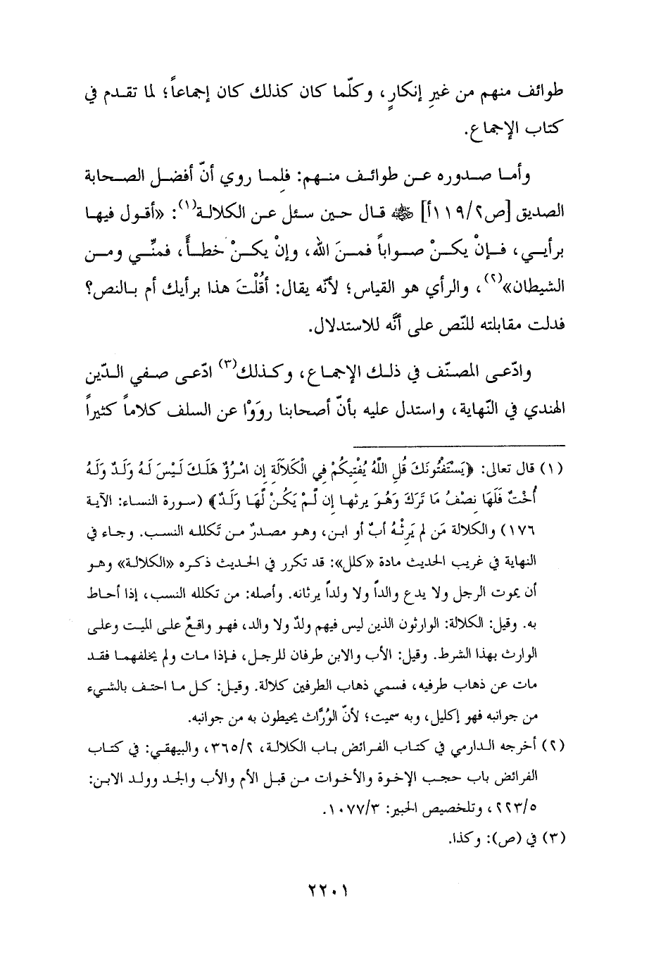 وادّعى المصنّف في ذلك الإجماع، وكذلك (¬٣) ادّعى صفي الدّين الهندي في النِّهاية، واستدل عليه بأنّ أصحابنا روَوْا عن السلف كلامًا كثيرًا