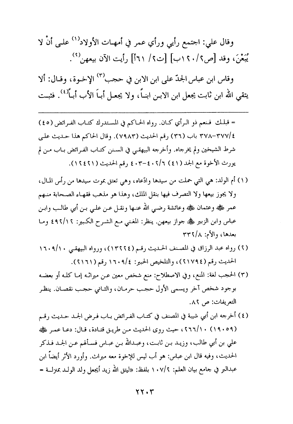 (¬١) أم الولد: هي التي حملت من سيدها وادّعاه، وهي تعتق بموت سيدها من رأس المال، ولا يجوز بيعها ولا التصرف فيها بنقل الملك، وهذا هو مذهب فقهاء الصحابة منهم عمر - رضي الله عنه - وعثمان - رضي الله عنه - وعائشة رضي الله عنها ونقل عن علي بن أبي طالب وابن عباس وابن الزبير - رضي الله عنهم - جواز بيعهن. ينظر: المغني مع الشرح الكبير: ١٢/ ٤٩٢ وما بعدها، والأم: ٨/ ٣٣٢.