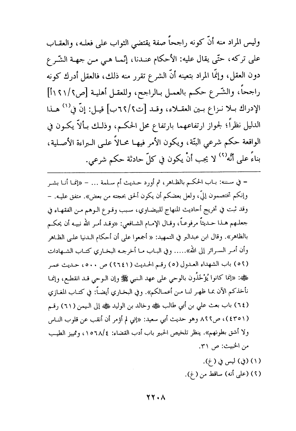 = في سننه: باب الحكم بالظاهر، ثم أورد حديث أم سلمة. . . - "إنما أنا بشر وإنكم تختصمون إليّ، ولعل بعضكم أن يكون ألحق بحجته من بعض". متفق عليه. - وقد ثبت في تخريج أحاديث المنهاج للبيضاوي، سبب وقوع الوهم من الفقهاء في جعلهم هذا حديثًا مرفوعًا، وقال الإمام الشافعي: "وقد أمر الله نبيه أن يحكم بالظاهر". وقال ابن عبد البر في التمهيد: "أجمعوا على أن أحكام الدنيا على الظاهر وأن أمر السرائر إلى الله". . . . . وفي الباب ما أخرجه البخاري كتاب الشهادات (٥٢) باب الشهداء العدول (٥) رقم الحديث (٢٦٤١) ص ٥٠٠، حديث عمر - رضي الله عنه -: "إنما كانوا يُؤْخَذُون بالوحي على عهد النبي - صلى الله عليه وسلم - وإن الوحي قد انقطع، وإنما نأخذكم الآن بما ظهر لنا من أعمالكم". وفي البخاري أيضًا: في كتاب المغازي (٦٤) باب بعث علي بن أبي طالب - رضي الله عنه - وخالد بن الوليد - رضي الله عنه - إلى اليمن (٦١) رقم (٤٣٥١)، ص ٨٢٢ وهو حديث أبي سعيد: "إني لم أؤمر أن أنقب عن قلوب الناس ولا أشق بطونهم". ينظر تلخيص الحبير باب أدب القضاء: ٤/ ١٥٦٨، وتمييز الطيب من الخبيث: ص ٣١.