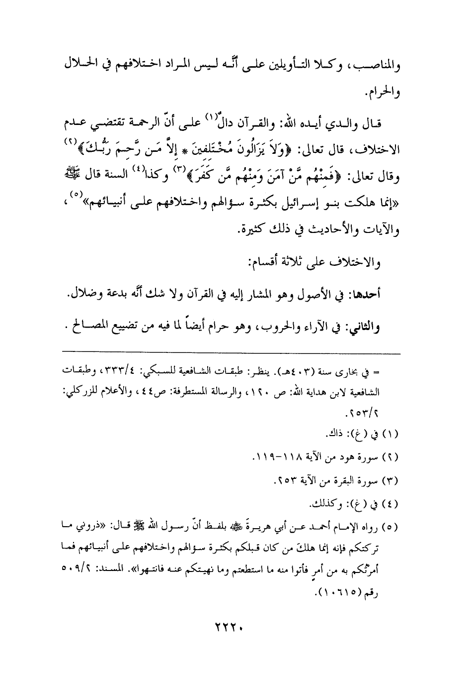 قال والدي أيده الله: والقرآن دالٌ (¬١) على أنّ الرحمة تقتضي عدم الاختلاف، قال تعالى: {وَلَا يَزَالُونَ مُخْتَلِفِينَ (١١٨) إِلَّا مَنْ رَحِمَ رَبُّكَ} (¬٢) وقال تعالى: {فَمِنْهُم مَّنْ آمَنَ وَمِنْهُم مَّن كَفَرَ} (¬٣) وكذا (¬٤) السنة قال - صلى الله عليه وسلم - "إنما هلكت بنو إسرائيل بكثرة سؤالهم واختلافهم على أنبيائهم" (¬٥)، والآيات والأحاديث في ذلك كثيرة.