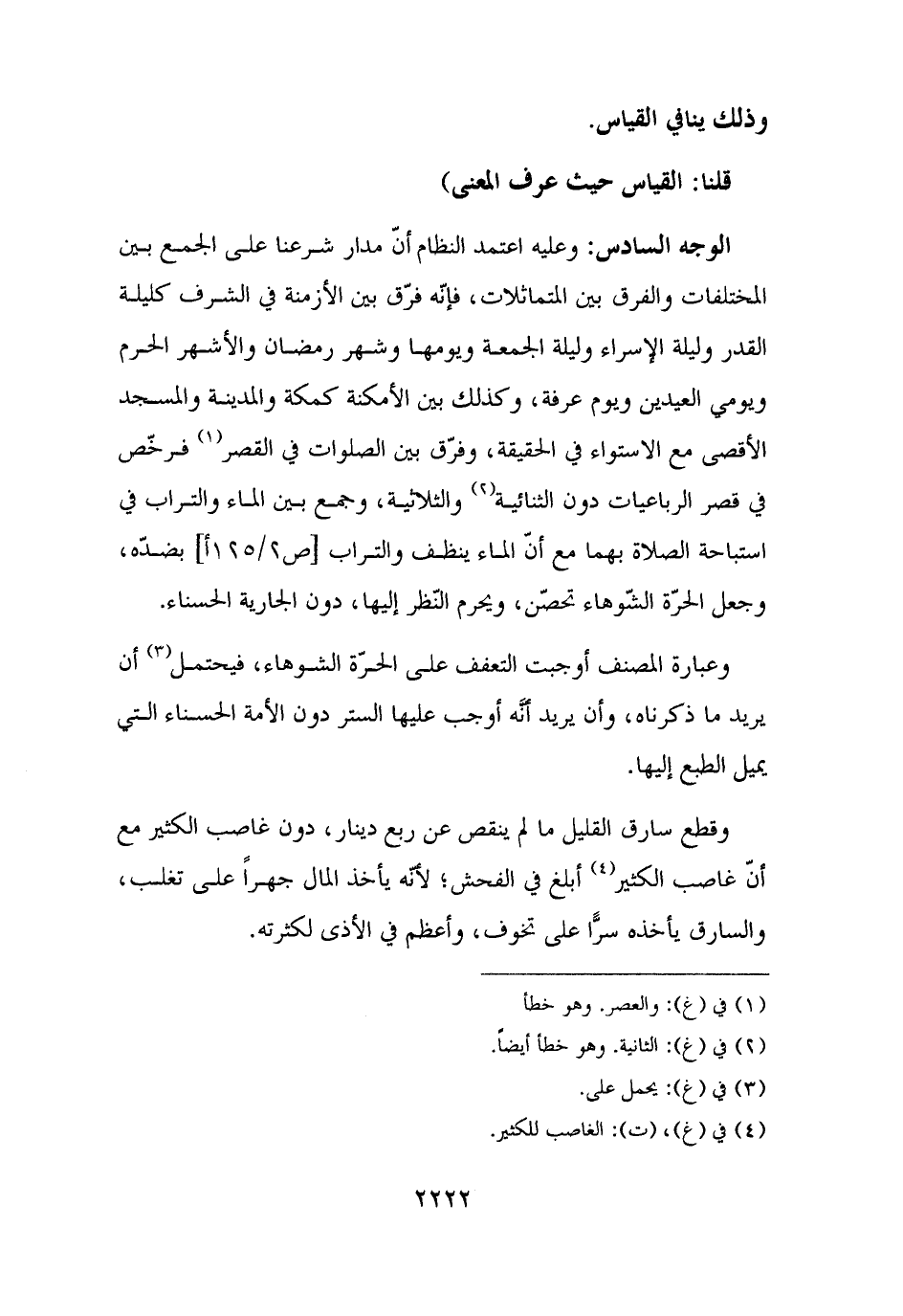 الوجه السادس: وعليه اعتمد النظام أنّ مدار شرعنا على الجمع بين المختلفات والفرق بين المتماثلات، فإنّه فرّق بين الأزمنة في الشرف كليلة القدر وليلة الإسراء وليلة الجمعة ويومها وشهر رمضان والأشهر الحرم ويومي العيدين ويوم عرفة، وكذلك بين الأمكنة كمكة والمدينة والمسجد الأقصى مع الاستواء في الحقيقة، وفرّق بين الصلوات في القصر (¬١) فرخّص في قصر الرباعيات دون الثنائية (¬٢) والثلاثية، وجمع بين الماء والتراب في استباحة الصلاة بهما مع أنّ الماء ينظف والتراب بضدّه، وجعل الحرّة الشّوهاء تحصّن، ويحرم النّظر إليها، دون الجارية الحسناء.