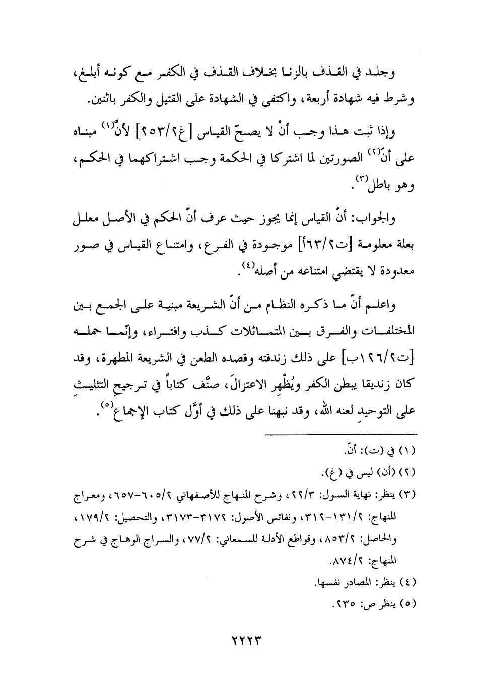 واعلم أنّ ما ذكره النظام من أنّ الشريعة مبنية على الجمع بين المختلفات والفرق بين المتماثلات كذب وافتراء، وإنّما حمله على ذلك زندقته وقصده الطعن في الشريعة المطهرة، وقد كان زنديقا يبطن الكفر ويُظْهِر الاعتزالَ، صنَّف كتابًا في ترجيحِ التثليثِ على التوحيدِ لعنه الله، وقد نبهنا على ذلك في أوَّل كتاب الإجماع (¬٥).