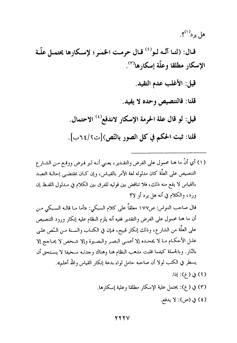 قال صاحب النبراس: ص ١٧٧ معلقًا على كلام السبكي: "أما ما قاله السبكي من أن ما هنا محمول على الفرض والتقدير ففيه أنه يلزم النظام عليه إنكار ورود التنصيص على العلَّة من الشارع، وذلك إنكار قبيح، فإن في الكتاب والسنة من النّص على علل الأحكام ما لا يجحده إلا أعمى البصر والبصيرة وإلا شخص لا يحاجج إلا بالنَّار. وبالجملة كيفما قلبت مذهب النظام هنا وهناك وجدته سخيفا لا يستحق أن يسطر في الكتب لولا أن صاحبه حامل لواء بدعة إنكار القياس والله أعلم".