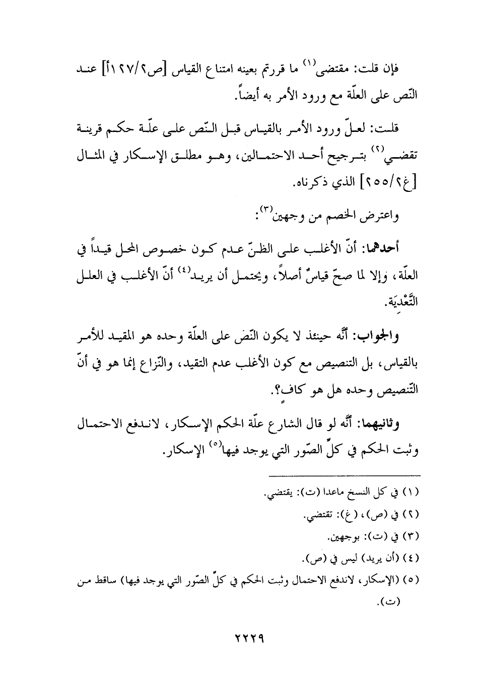 قلت: لعلّ ورود الأمر بالقياس قبل النّص على علّة حكم قرينة تقضي (¬٢) بترجيح أحد الاحتمالين، وهو مطلق الإسكار في المثال الذي ذكرناه.