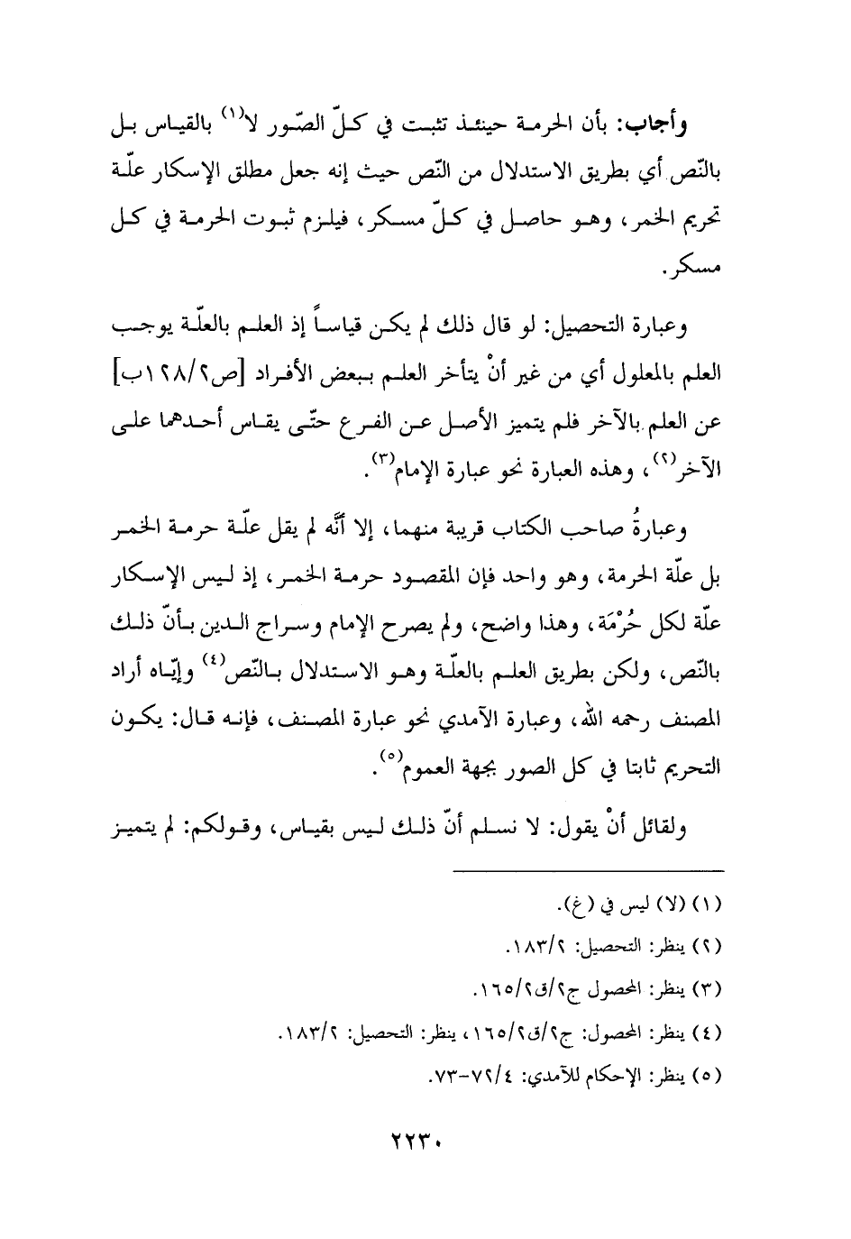 وعبارةُ صاحب الكتاب قريبة منهما، إلا أنَّه لم يقل علّة حرمة الخمر بل علّة الحرمة، وهو واحد فإن المقصود حرمة الخمر، إذ ليس الإسكار علّة لكل حُرْمَة، وهذا واضح، ولم يصرح الإمام وسراج الدين بأنّ ذلك بالنّص، ولكن بطريق العلم بالعلّة وهو الاستدلال بالنّص (¬٤) وإيّاه أراد المصنف رحمه الله، وعبارة الآمدي نحو عبارة المصنف، فإنه قال: يكون التحريم ثابتا في كل الصور بجهة العموم (¬٥).