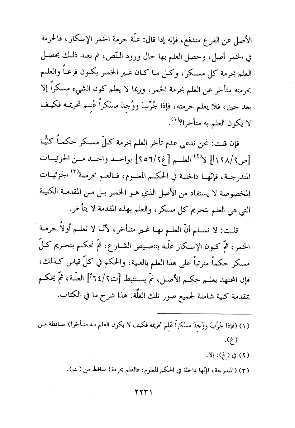 قلت: لا نسلم أنّ العلم بها غير متأخر، لأنَّا لا نعلم أولًا حرمة الخمر، ثمّ كون الإسكار علّة بتنصيص الشارع، ثمّ نحكم بتحريم كلّ مسكر حكمًا مترتبًا على هذا العلم بالعلية، والحكم في كلّ قياس كذلك، فإن المجتهد يعلم حكم الأصل، ثمّ يستنبط العلّة، ثمّ يحكم بمقدمة كلية شاملة لجميع صور تلك العلَّة. هذا شرح ما في الكتاب.