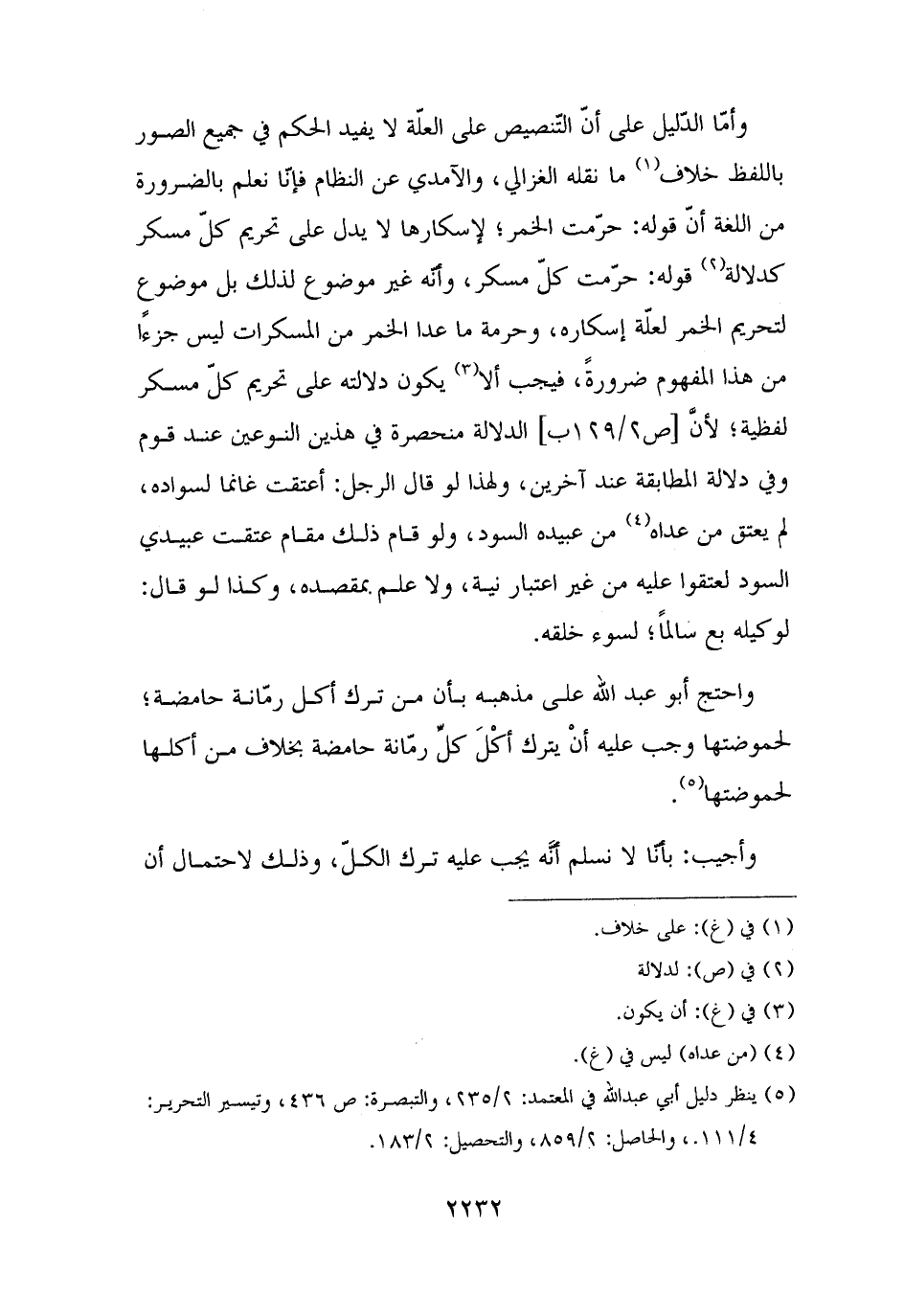 (¬٥) ينظر دليل أبي عبد الله في المعتمد: ٢/ ٢٣٥، والتبصرة: ص ٤٣٦، وتيسير التحرير: ٤/ ١١١، والحاصل: ٢/ ٨٥٩، والتحصيل: ٢/ ١٨٣.