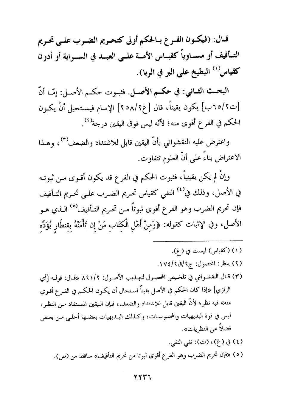 (¬٣) قال النقشواني في تلخيص المحصول لتهذيب الأصول: ٢/ ٨٢١ "قال: قوله [أي الرازي] "إذا كان الحكم في الأصل يقينًا استحال أن يكون الحكم في الفرع أقوى منه" فيه نظر؛ لأنّ اليقين قابل للاشتداد والضعف، فإن اليقين المستفاد من النظر، ليس في قوة البديهيات والمحسوسات، وكذلك البديهيات بعضها أجلى من بعض فضلًا عن النظريات".