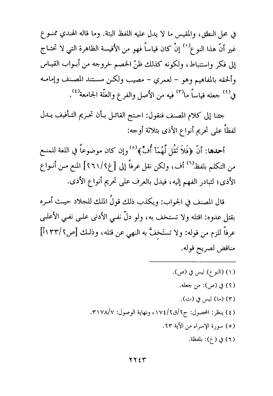 في محل النطق، والمقيس ما لا يدل عليه اللفظ البتة. وما قاله الهندي ممنوع غير أنّ هذا النوع (¬١) إنْ كان قياسًا فهو من الأقيسة الظاهرة التي لا تحتاج إلى فكر واستنباط، ولكونه كذلك ظنّ الخصم خروجه من أبواب القياس وألحقه بالمفاهيم وهو - لعمري - مصيب ولكن مستند المصنف وإمامه في (¬٢) جعله قياسًا ما (¬٣) فيه من الأصل والفرع والعلّة الجامعة (¬٤).