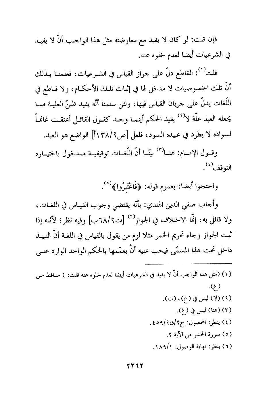 وأجاب صفي الدين الهندي: بأنَّه يقتضي وجوب القياس في اللغات، ولا قائل به، إنّما الاختلاف في الجواز (¬٦) وفيه نظر؛ لأنَّه إذا ثبت الجواز وجاء تحريم الخمر مثلا لزم من يقول بالقياس في اللغة أنّ النبيذ داخل تحت هذا المسمّى فيجب عليه أنْ يعمّمها بالحكم الواحد الوارد على