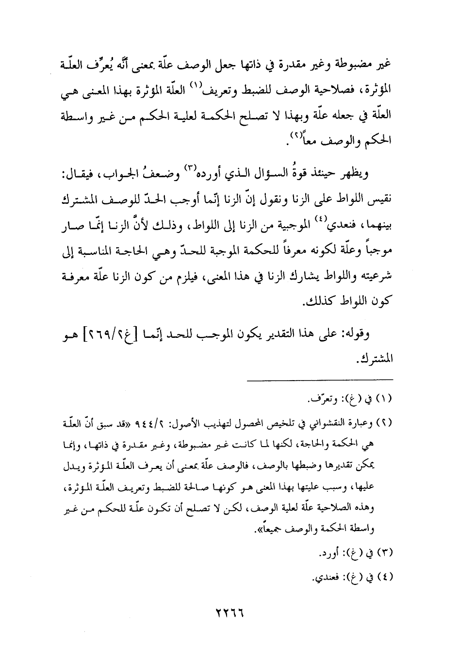 (¬٢) وعبارة النقشواني في تلخيص المحصول لتهذيب الأصول: ٢/ ٩٤٤ "قد سبق أنّ العلّة هي الحكمة والحاجة، لكنها لما كانت غير مضبوطة، وغير مقدرة في ذاتها، وإنما يمكن تقديرها وضبطها بالوصف، فالوصف علّة بمعنى أن يعرف العلّة المؤثرة ويدل عليها، وسبب عليتها بهذا المعنى هو كونها صالحة للضبط وتعريف العلّة المؤثرة، وهذه الصلاحية علّة لعلية الوصف، لكن لا تصلح أن تكون علّة للحكم من غير واسطة الحكمة والوصف جميعًا".