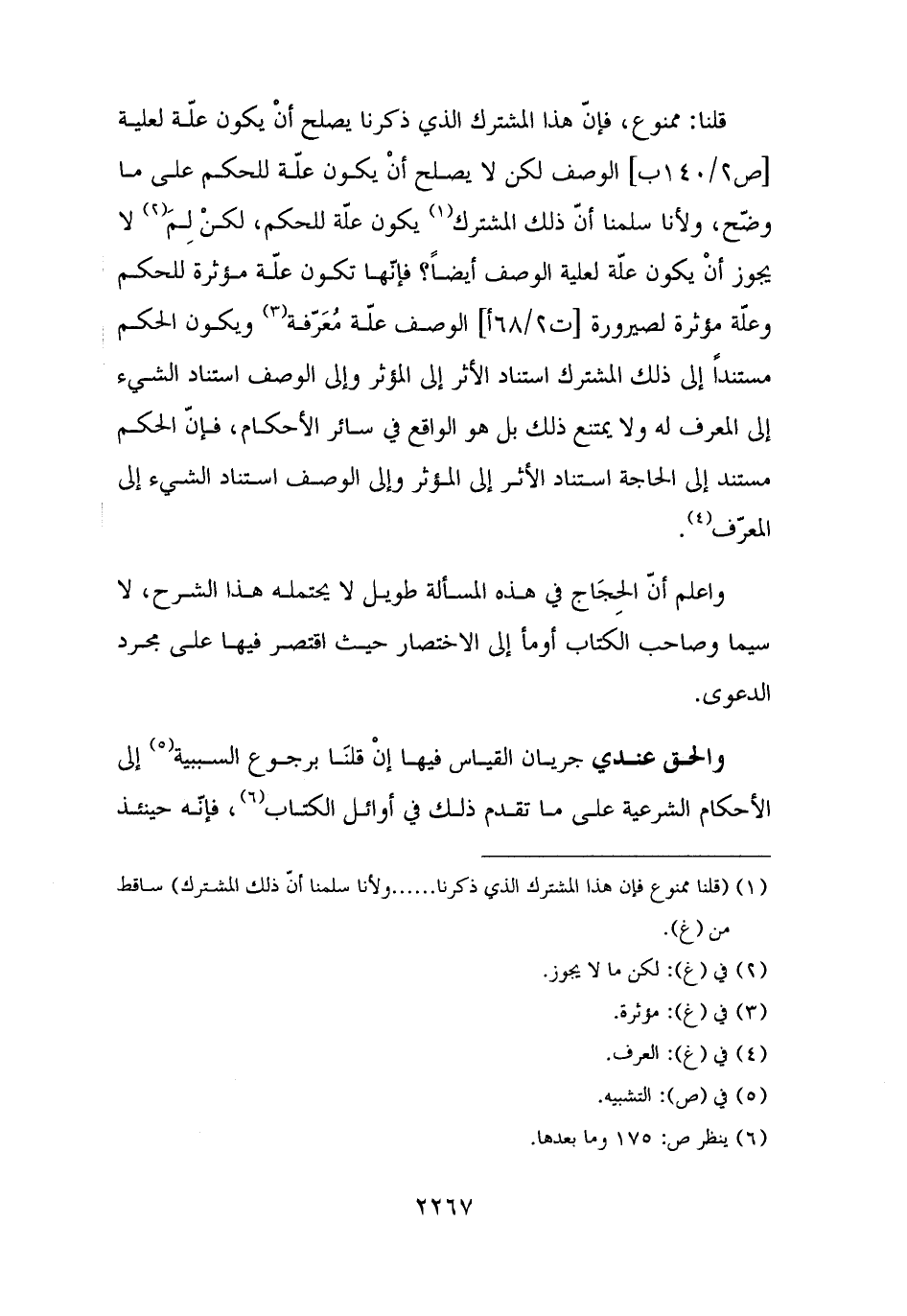 قلنا: ممنوع، فإنّ هذا المشترك الذي ذكرنا يصلح أنْ يكون علّة لعلية الوصف لكن لا يصلح أنْ يكون علّة للحكم على ما وضّح، ولأنا سلمنا أنّ ذلك المشترك (¬١) يكون علّة للحكم، لكنْ لِمَ (¬٢) لا يجوز أنْ يكون علّة لعلية الوصف أيضًا؟ فإنّها تكون علّة مؤثرة للحكم وعلَّة مؤثرة لصيرورة الوصف علّة مُعَرّفة (¬٣) ويكون الحكم مستندًا إلى ذلك المشترك استناد الأثر إلى المؤثر وإلى الوصف استناد الشيء إلى المعرف له ولا يمتنع ذلك بل هو الواقع في سائر الأحكام، فإنّ الحكم مستند إلى الحاجة استناد الأثر إلى المؤثر وإلى الوصف استناد الشيء إلى المعرّف (¬٤).