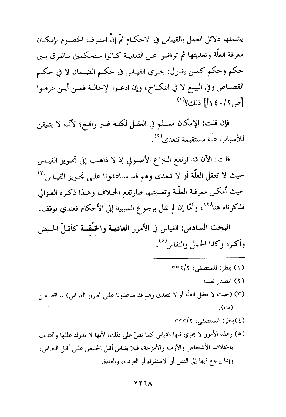 (¬٥) وهذه الأمور لا يجري فيها القياس كما نصَّ على ذلك, لأنها لا تدرك عللها وتختلف باختلاف الأشخاص والأزمنة والأمزجة، فلا يقاس أقل الحيض على أقل النفاس، وإنما يرجع فيها إلى النص أو الاستقراء أو العرف، والعادة.