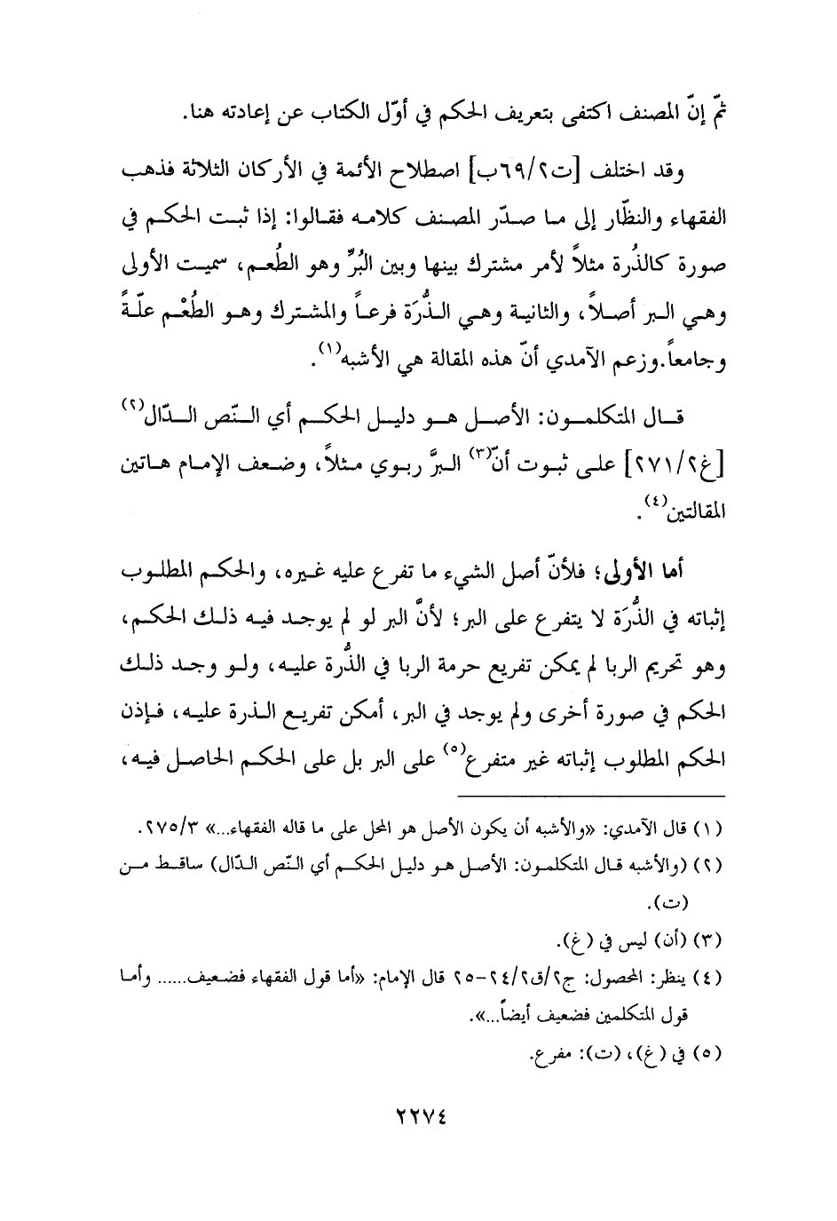 قال المتكلمون: الأصل هو دليل الحكم أي النّص الدّال (¬٢) على ثبوت أنّ (¬٣) البرَّ ربوي مثلًا، وضعف الإمام هاتين المقالتين (¬٤).