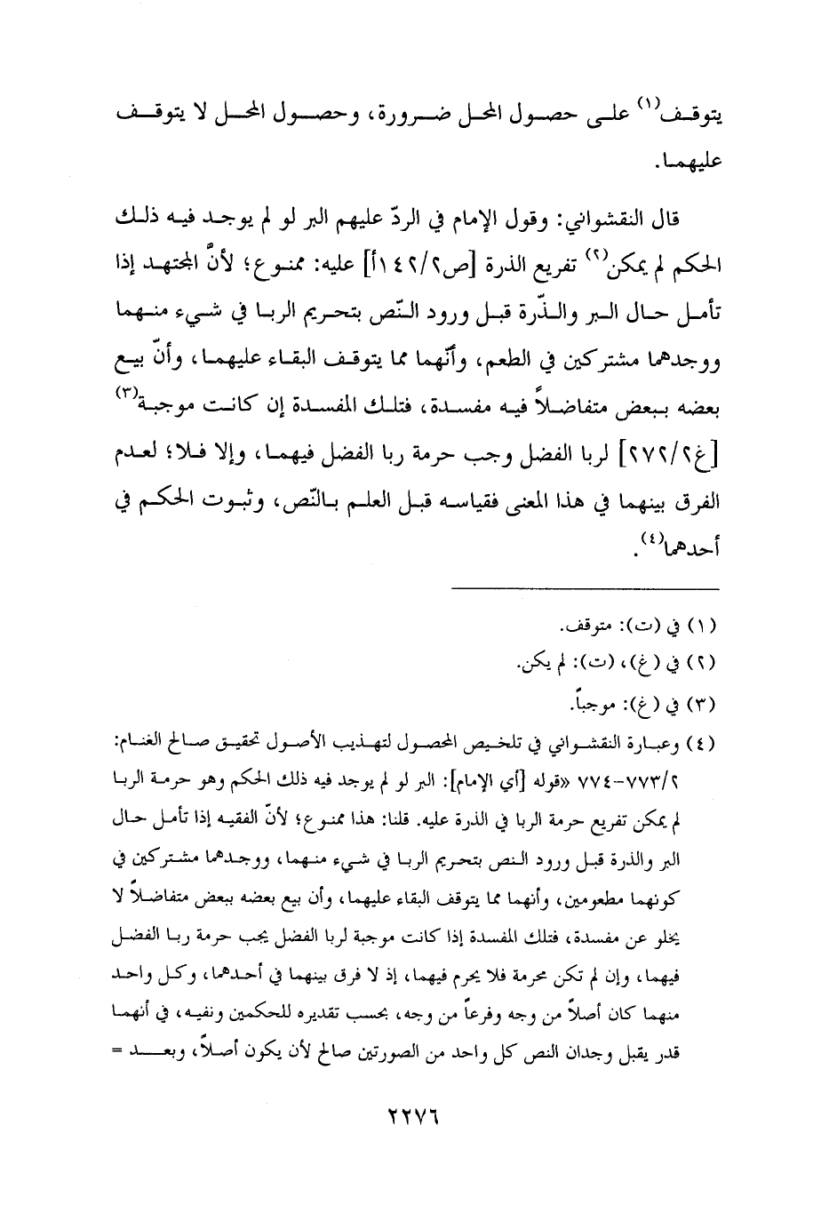 (¬٤) وعبارة النقشواني في تلخيص المحصول لتهذيب الأصول تحقيق صالح الغنام: ٢/ ٧٧٣ - ٧٧٤ "قوله [أي الإمام]: البر لو لم يوجد فيه ذلك الحكم وهو حرمة الربا لم يمكن تفريع حرمة الربا في الذرة عليه. قلنا: هذا ممنوع؛ لأنّ الفقيه إذا تأمل حال البر والذرة قبل ورود النص بتحريم الربا في شيء منهما، ووجدهما مشتركين في كونهما مطعومين، وأنهما مما يتوقف البقاء عليهما، وأن بيع بعضه ببعض متفاضلًا لا يخلو عن مفسدة، فتلك المفسدة إذا كانت موجبة لربا الفضل يجب حرمة ربا الفضل فيهما، وإن لم تكن محرمة فلا يحرم فيهما، إذ لا فرق بينهما في أحدهما، وكل واحد منهما كان أصلًا من وجه وفرعًا من وجه، بحسب تقديره للحكمين ونفيه، في أنهما قدر يقبل وجدان النص كل واحد من الصورتين صالح لأن يكون أصلًا، وبعد =