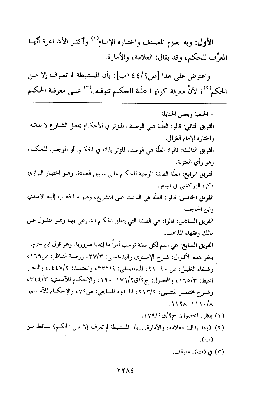 الفريق السابع: هي اسم لكل صفة توجب أمرًا ما إيجابا ضروريا. وهو قول ابن حزم. ينظر هذه الأقوال: شرح الإسنوي والبدخشي: ٣/ ٣٧، روضة الناظر: ص ١٦٩، وشفاء الغليل: ص ٢٠ - ٢١، المستصفى: ٢/ ٣٣٦، والمعتمد: ٢/ ٤٤٧، والبحر المحيط: ٣/ ١٦٥، والمحصول: ج ٢/ ق ٢/ ١٧٩ - ١٩٠، والإحكام للآمدي: ٣/ ٣٤٤، وشرح مختصر المنتهى: ٢/ ٢١٣، الحدود للباجي: ص ٧٢، والإحكام للآمدي: ٨/ ١١١٠ - ١١٢٨.