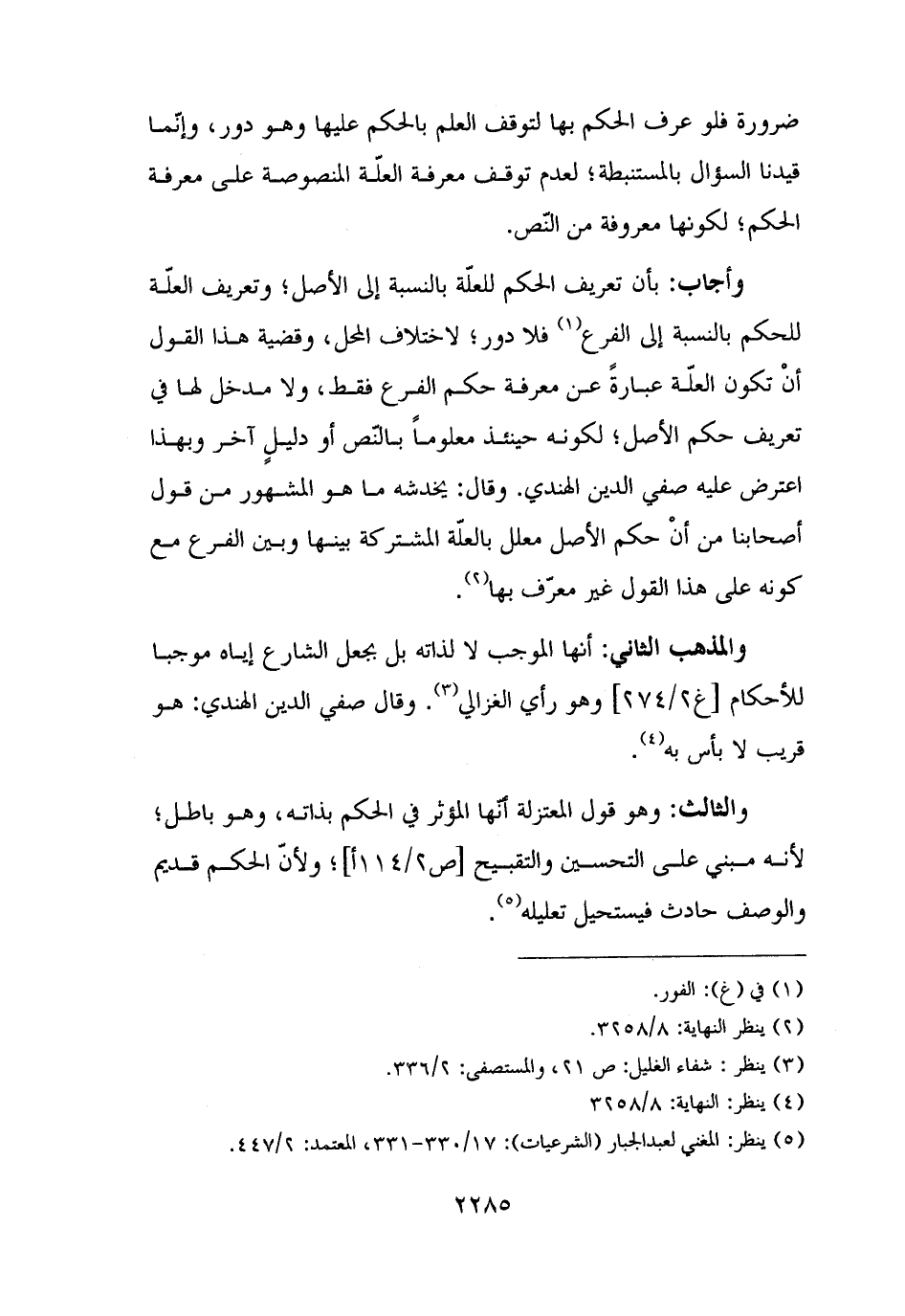 وأجاب: بأن تعريف الحكم للعلّة بالنسبة إلى الأصل؛ وتعريف العلّة للحكم بالنسبة إلى الفرع (¬١) فلا دور؛ لاختلاف المحل، وقضية هذا القول أنْ تكون العلّة عبارةً عن معرفة حكم الفرع فقط، ولا مدخل لها في تعريف حكم الأصل؛ لكونه حينئذ معلومًا بالنّص أو دليلٍ آخر وبهذا اعترض عليه صفي الدين الهندي. وقال: يخدشه ما هو المشهور من قول أصحابنا من أنْ حكم الأصل معلل بالعلّة المشتركة بينها وبين الفرع مع كونه على هذا القول غير معرّف بها (¬٢).