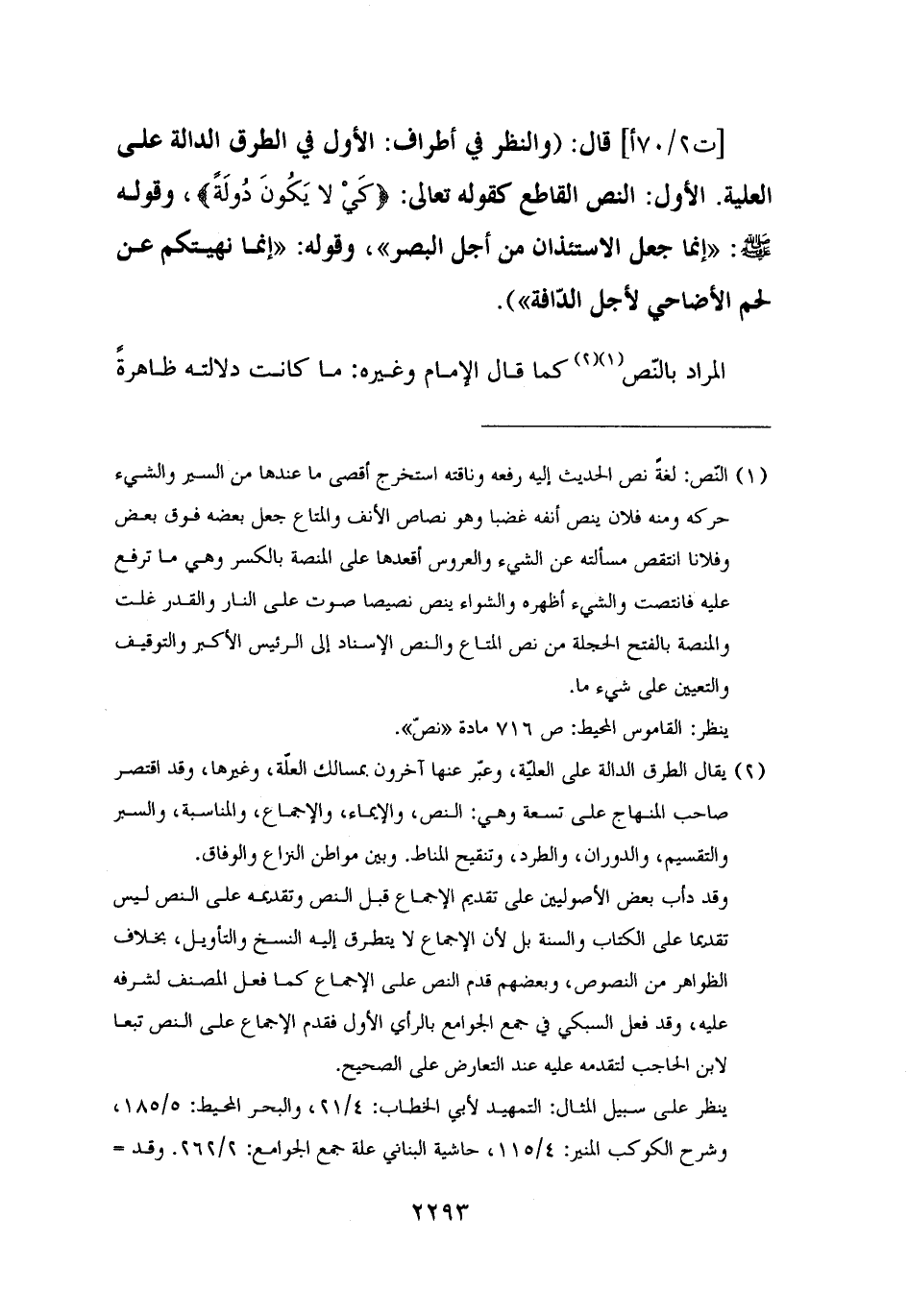 قال: (والنظر في أطراف: الأول في الطرق الدالة على العلية. الأول: النص القاطع كقوله تعالى: {كَيْ لَا يَكُونَ دُولَةً}، وقوله - صلى الله عليه وسلم -: "إنما جعل الاستئذان من أجل البصر"، وقوله: "إنما نهيتكم عن لحم الأضاحي لأجل الدّافة").