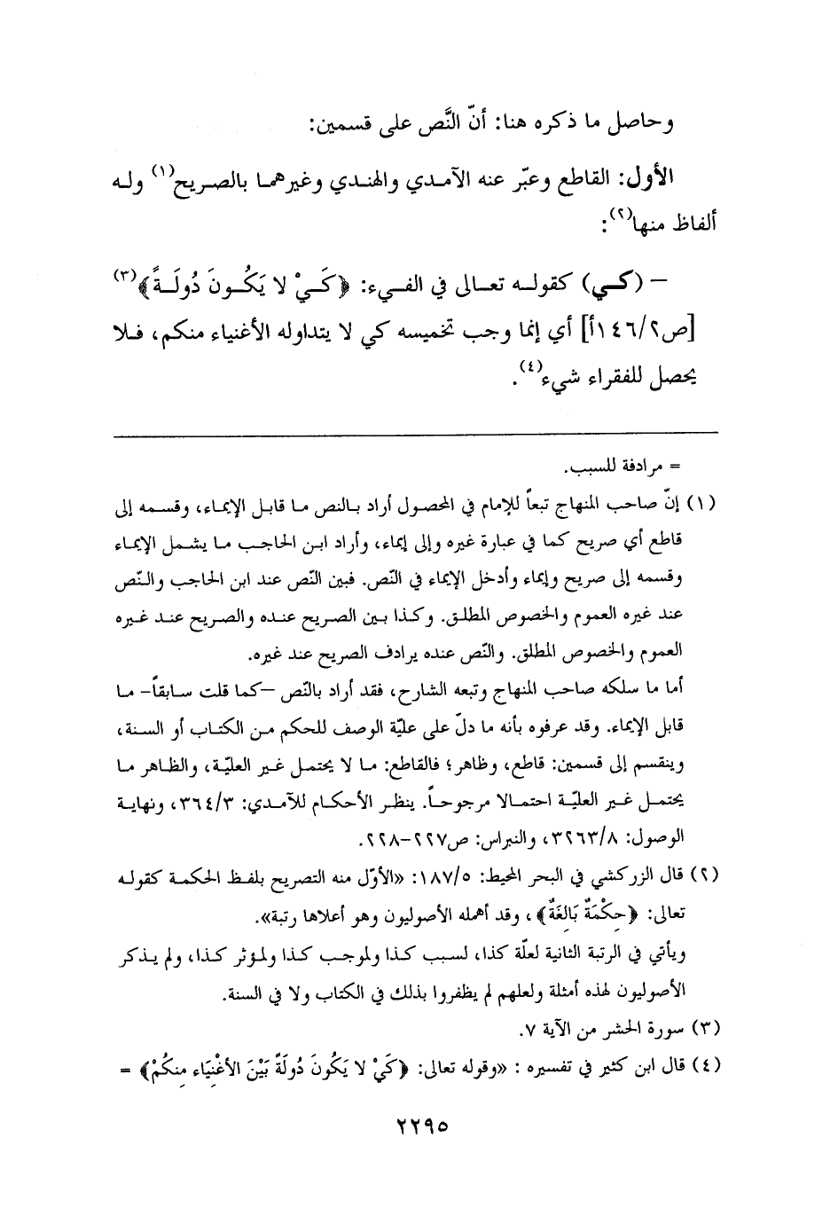 (¬١) إنّ صاحب المنهاج تبعًا للإمام في المحصول أراد بالنص ما قابل الإيماء، وقسمه إلى قاطع أي صريح كما في عبارة غيره وإلى إيماء، وأراد ابن الحاجب ما يشمل الإيماء وقسمه إلى صريح وإيماء وأدخل الإيماء في النّص. فبين النّص عند ابن الحاجب والنّص عند غيره العموم والخصوص المطلق. وكذا بين الصريح عنده والصريح عند غيره العموم والخصوص المطلق. والنّص عنده يرادف الصريح عند غيره.