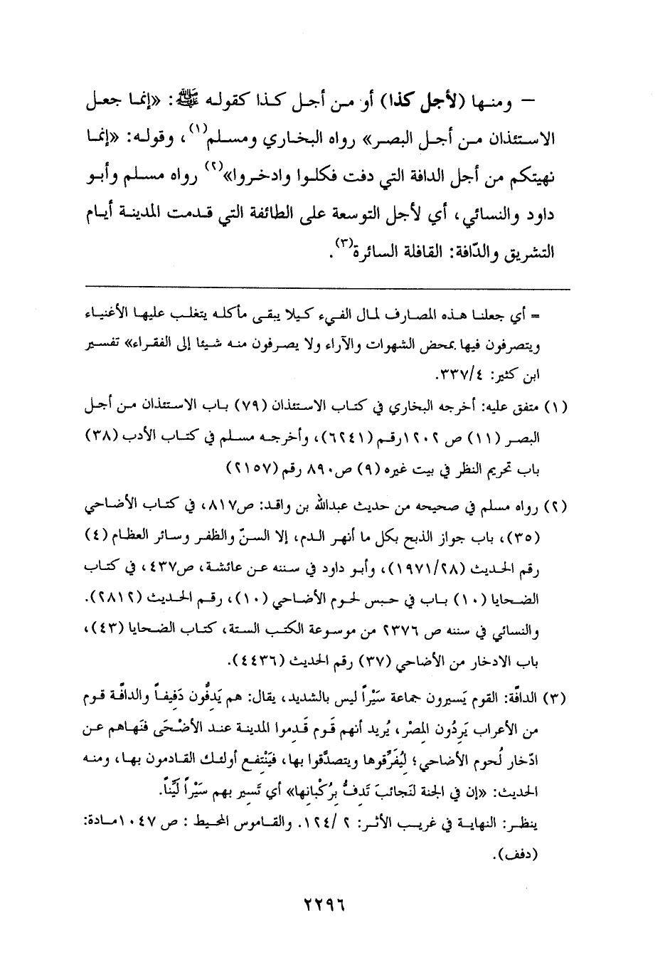 - ومنها (لأجل كذا) أو من أجل كذا كقوله - صلى الله عليه وسلم -: "إنما جعل الاستئذان من أجل البصر" رواه البخاري ومسلم (¬١)، وقوله: "إنما نهيتكم من أجل الدافة التي دفت فكلوا وادخروا" (¬٢) رواه مسلم وأبو داود والنسائي، أي لأجل التوسعة على الطائفة التي قدمت المدينة أيام التشريق والدّافة: القافلة السائرة (¬٣).