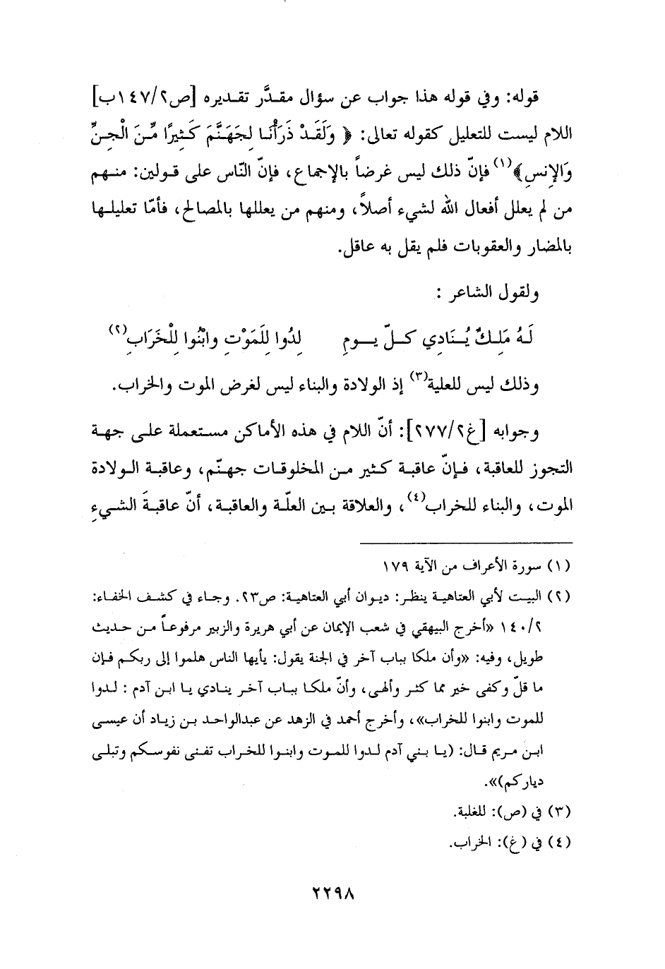 وجوابه: أنّ اللام في هذه الأماكن مستعملة على جهة التجوز للعاقبة، فإنّ عاقبة كثير من المخلوقات جهنّم، وعاقبة الولادة الموت، والبناء للخراب (¬٤)، والعلاقة بين العلّة والعاقبة، أنّ عاقبةَ الشيءِ