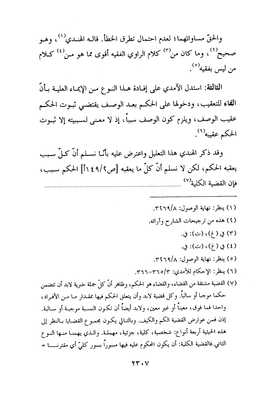 وقد ذكر الهندي هذا التعليل واعترض عليه بأنّا نسلم أنّ كلّ سبب يعقبه الحكم، لكن لا نسلم أنّ كلّ ما يعقبه الحكم سبب، فإن القضية الكلية (¬٧). . . . . . . . . . . . . . . .