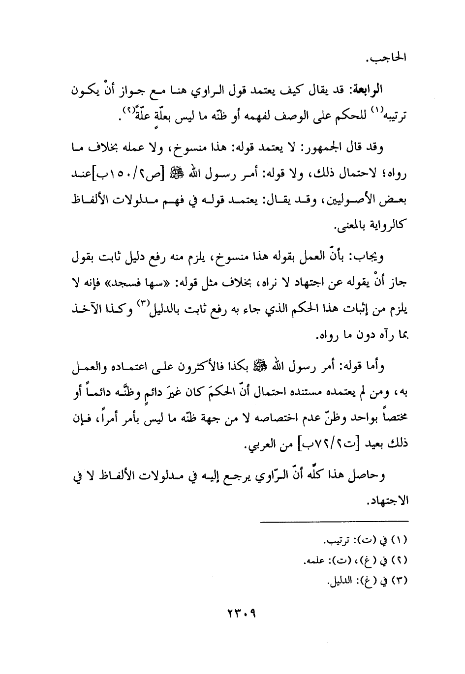 ويجاب: بأنّ العمل بقوله هذا منسوخ، يلزم منه رفع دليل ثابت بقول جاز أنْ يقوله عن اجتهاد لا نراه، بخلاف مثل قوله: "سها فسجد" فإنه لا يلزم من إثبات هذا الحكم الذي جاء به رفع ثابت بالدليل (¬٣) وكذا الآخذ بما رآه دون ما رواه.