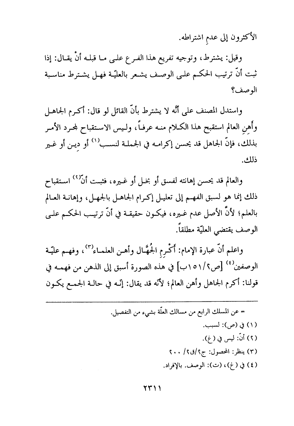 واعلم أنّ عبارة الإمام: أَكْرِمِ الجُهَّال وأهن العلماء (¬٣)، وفهم عليّة الوصفين (¬٤) في هذه الصورة أسبق إلى الذهن من فهمه في قولنا: أكرم الجاهل وأهن العالم؛ لأنّه قد يقال: إنّه في حالة الجمع يكون