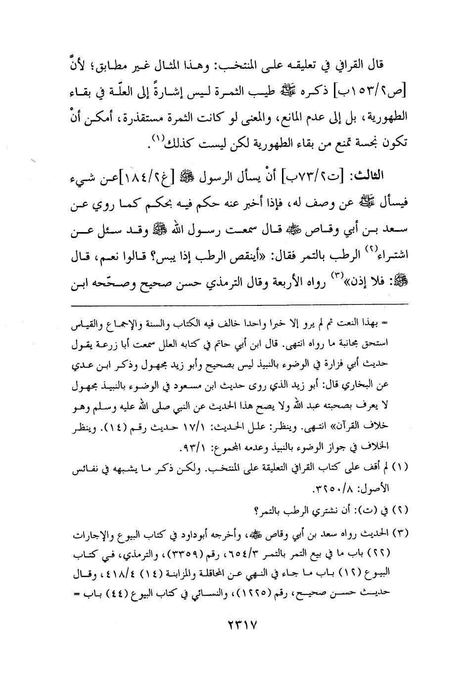 الثالث: أنْ يسأل الرسول - صلى الله عليه وسلم - عن شيء فيسأل - صلى الله عليه وسلم - عن وصف له، فإذا أخبر عنه حكم فيه بحكم كما روي عن سعد بن أبي وقاص - رضي الله عنه - قال سمعت رسول الله - صلى الله عليه وسلم - وقد سئل عن اشتراء (¬٢) الرطب بالتمر فقال: "أينقص الرطب إذا يبس؟ قالوا نعم، قال - صلى الله عليه وسلم -: فلا إذن" (¬٣) رواه الأربعة وقال الترمذي حسن صحيح وصحّحه ابن