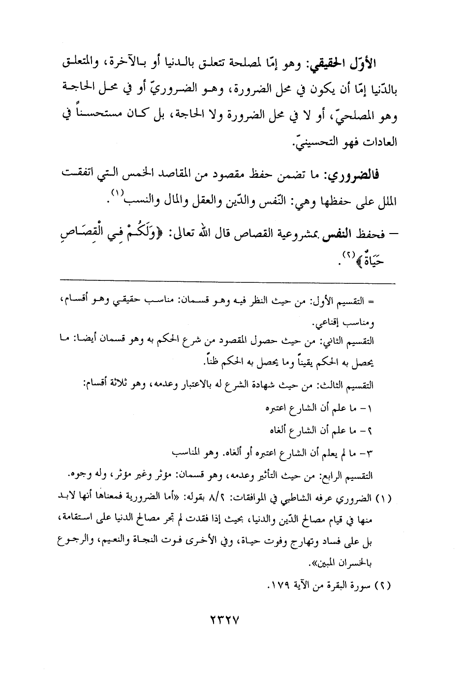 الأوّل الحقيقي: وهو إمّا لمصلحة تتعلق بالدنيا أو بالآخرة، والمتعلق بالدّنيا إمّا أن يكون في محل الضرورة، وهو الضروريّ أو في محل الحاجة وهو المصلحيّ، أو لا في محل الضرورة ولا الحاجة، بل كان مستحسنًا في العادات فهو التحسينيّ.
