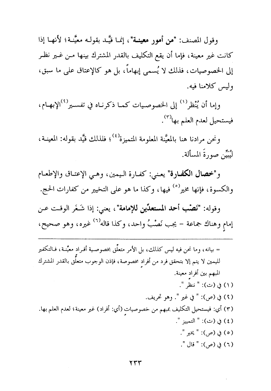 وقول المصنف: "من أمور معينة"، إنما قيَّد بقوله معيَّنة؛ لأنها إذا كانت غير معينة، فإما أن يقع التكليف بالقدر المشترك بينها من غير نظر إلى الخصوصيات، فذلك لا يُسمى إبهامًا، بل هو كالإعتاق على ما سبق، وليس كلامنا فيه.