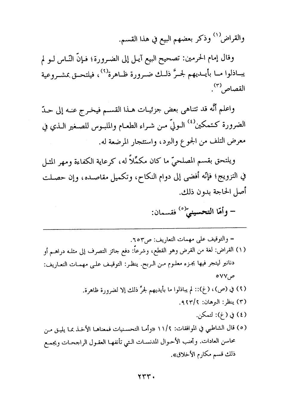 (¬٥) قال الشاطبي في الموافقات: ٢/ ١١ "وأما التحسينات فمعناها الأخذ بما يليق من محاسن العادات. وتجنب الأحوال المدنسات التي تأنفها العمول الراجحات ويجمع ذلك قسم مكارم الأخلاق".