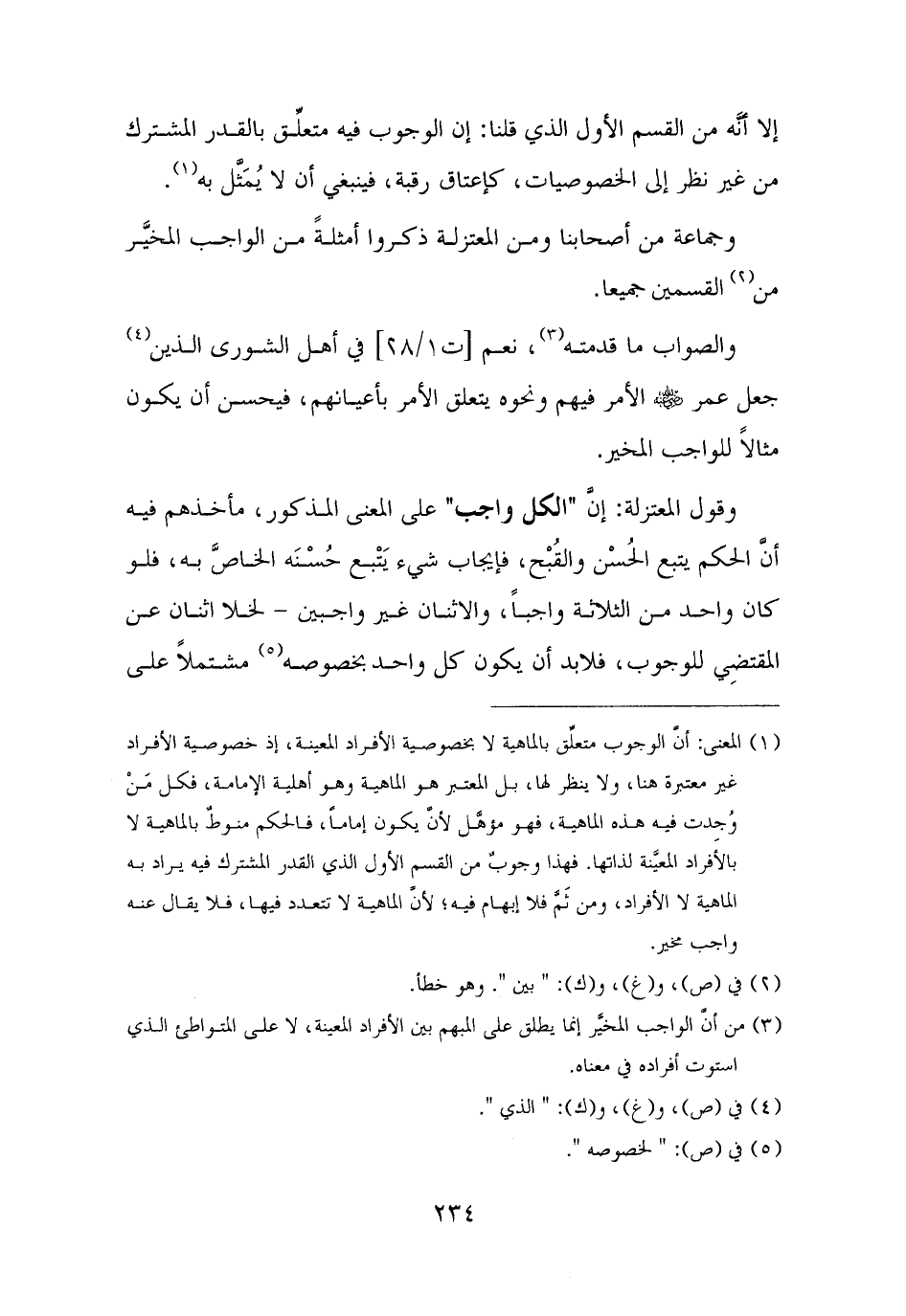 (¬١) المعنى: أنَّ الوجوب متعلِّق بالماهية لا بخصوصية الأفراد المعينة، إذ خصوصية الأفراد غير معتبرة هنا، ولا ينظر لها، بل المعتبر هو الماهية وهو أهلية الإمامة، فكل مَنْ وُجِدت فيه هذه الماهية، فهو مؤهَّل لأن يكون إمامًا، فالحكم منوطٌ بالماهية لا بالأفراد المعيَّنة لذاتها. فهذا وجوبٌ من القسم الأول الذي القدر المشترك فيه يراد به الماهية لا الأفراد، ومن ثَمَّ فلا إبهام فيه؛ لأنَّ الماهية لا تتعدد فيها، فلا يقال عنه واجب مخير.