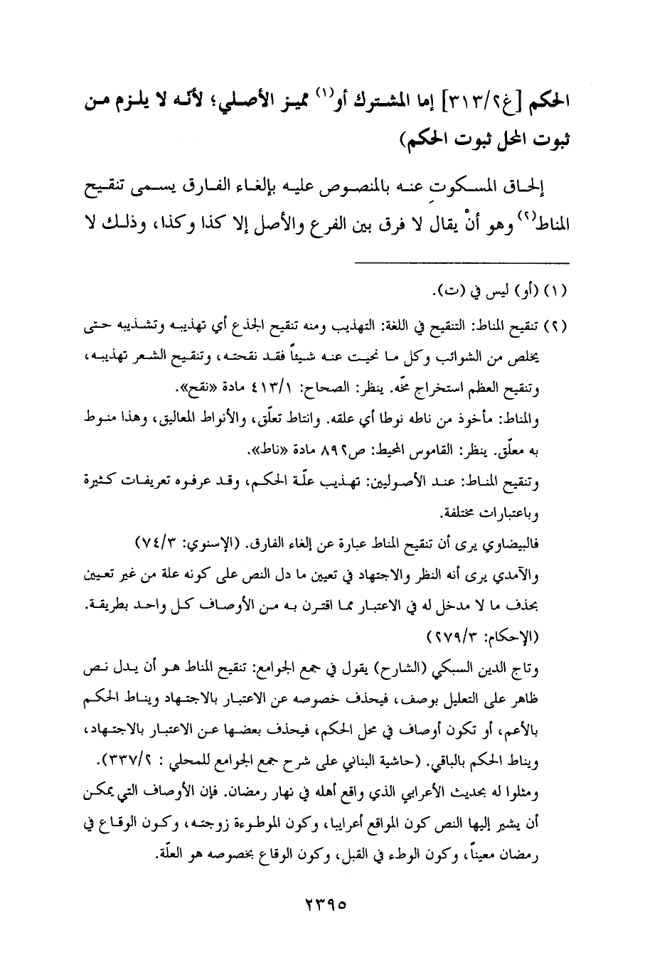 وتاج الدين السبكي (الشارح) يقول في جمع الجوامع: تنقيح المناط هو أن يدل نص ظاهر على التعليل بوصف، فيحذف خصوصه عن الاعتبار بالاجتهاد ويناط الحكم بالأعم، أو تكون أوصاف في محل الحكم، فيحذف بعضها عن الاعتبار بالاجتهاد، ويناط الحكم بالباقي. (حاشية البناني على شرح جمع الجوامع للمحلي: ٢/ ٣٣٧).