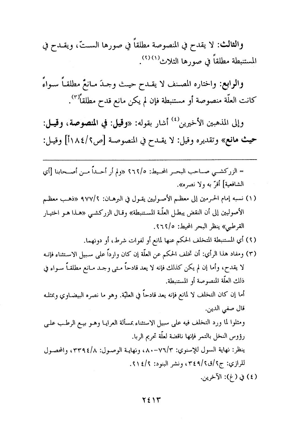 (¬٣) ومفاد هذا الرأي: أن تخلف الحكم عن العلّة إن كان واردًا على سبيل الاستثناء فإنه لا يقدح، وأما إن لم يكن كذلك فإنه لا يعد قادحًا متى وجد مانع مطلقًا سواء في ذلك العلّة المنصوصة أو المستنبطة.
