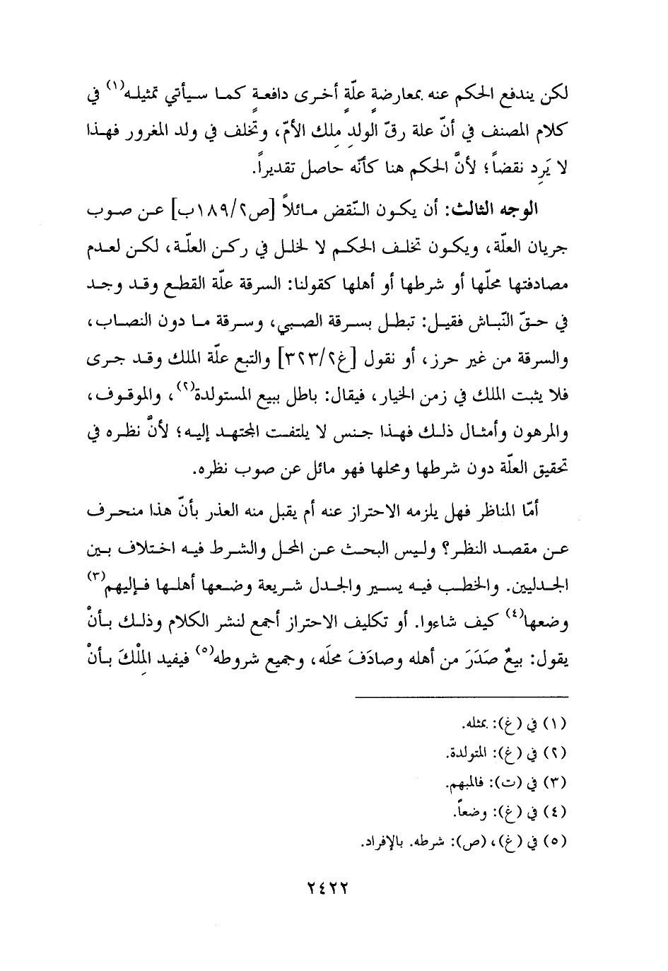 الوجه الثالث: أن يكون النّقض مائلًا عن صوب جريان العلّة، ويكون تخلف الحكم لا لخلل في ركن العلّة، لكن لعدم مصادفتها محلّها أو شرطها أو أهلها كقولنا: السرقة علّة القطع وقد وجد في حقّ النّباش فقيل: تبطل بسرقة الصبي، وسرقة ما دون النصاب، والسرقة من غير حرز، أو نقول والتبع علّة الملك وقد جرى فلا يثبت الملك في زمن الخيار، فيقال: باطل ببيع المستولدة (¬٢)، والموقوف، والمرهون وأمثال ذلك فهذا جنس لا يلتفت المجتهد إليه؛ لأنَّ نظره في تحقيق العلّة دون شرطها ومحلها فهو مائل عن صوب نظره.