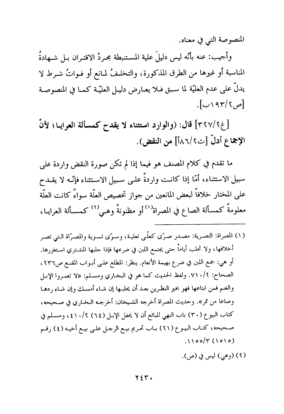 ما تقدم في كلام المصنف هو فيما إذا لم تكن صورة النقض واردة على سبيل الاستثناء، أمّا إذا كانت واردةً على سبيل الاستثناء فإنّه لا يقدح على المختار خلافًا لبعض المانعين من جواز تخصيص العلّة سواءً كانت العلّة معلومةً كمسألة الصاع في المصراة (¬١) أو مظنونةً وهي (¬٢) كمسألة العرايا،