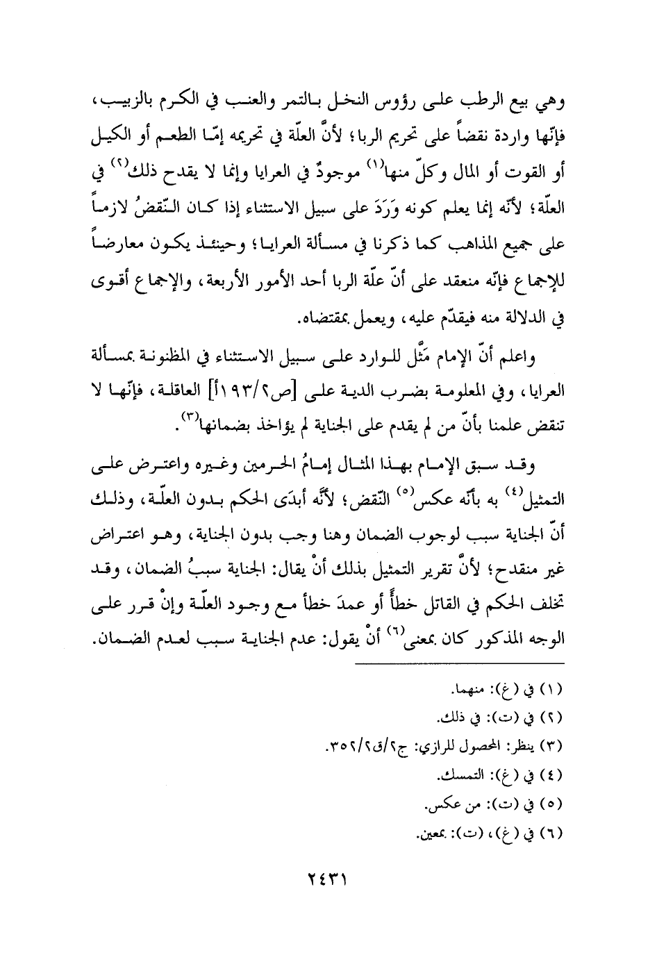 واعلم أنّ الإمام مَثَّل للوارد على سبيل الاستثناء في المظنونة بمسألة العرايا، وفي المعلومة بضرب الدية على العاقلة، فإنّها لا تنقض علمنا بأنّ من لم يقدم على الجناية لم يؤاخذ بضمانها (¬٣).