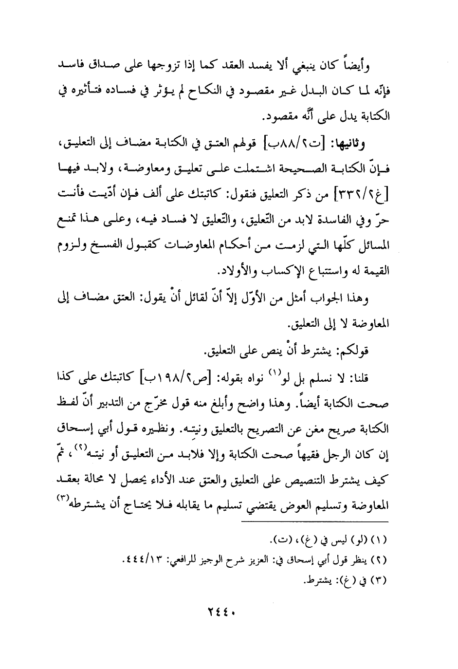 قلنا: لا نسلم بل لو (¬١) نواه بقوله: كاتبتك على كذا صحت الكتابة أيضًا. وهذا واضح وأبلغ منه قول مخرّج من التدبير أنّ لفظ الكتابة صريح مغن عن التصريح بالتعليق ونيته. ونظيره قول أبي إسحاق إن كان الرجل فقيهًا صحت الكتابة وإلا فلا بد من التعليق أو نيته (¬٢)، ثمّ كيف يشترط التنصيص على التعليق والعتق عند الأداء يحصل لا محالة بعقد المعاوضة وتسليم العوض يقتضي تسليم ما يقابله فلا يحتاج أن يشترطه (¬٣)