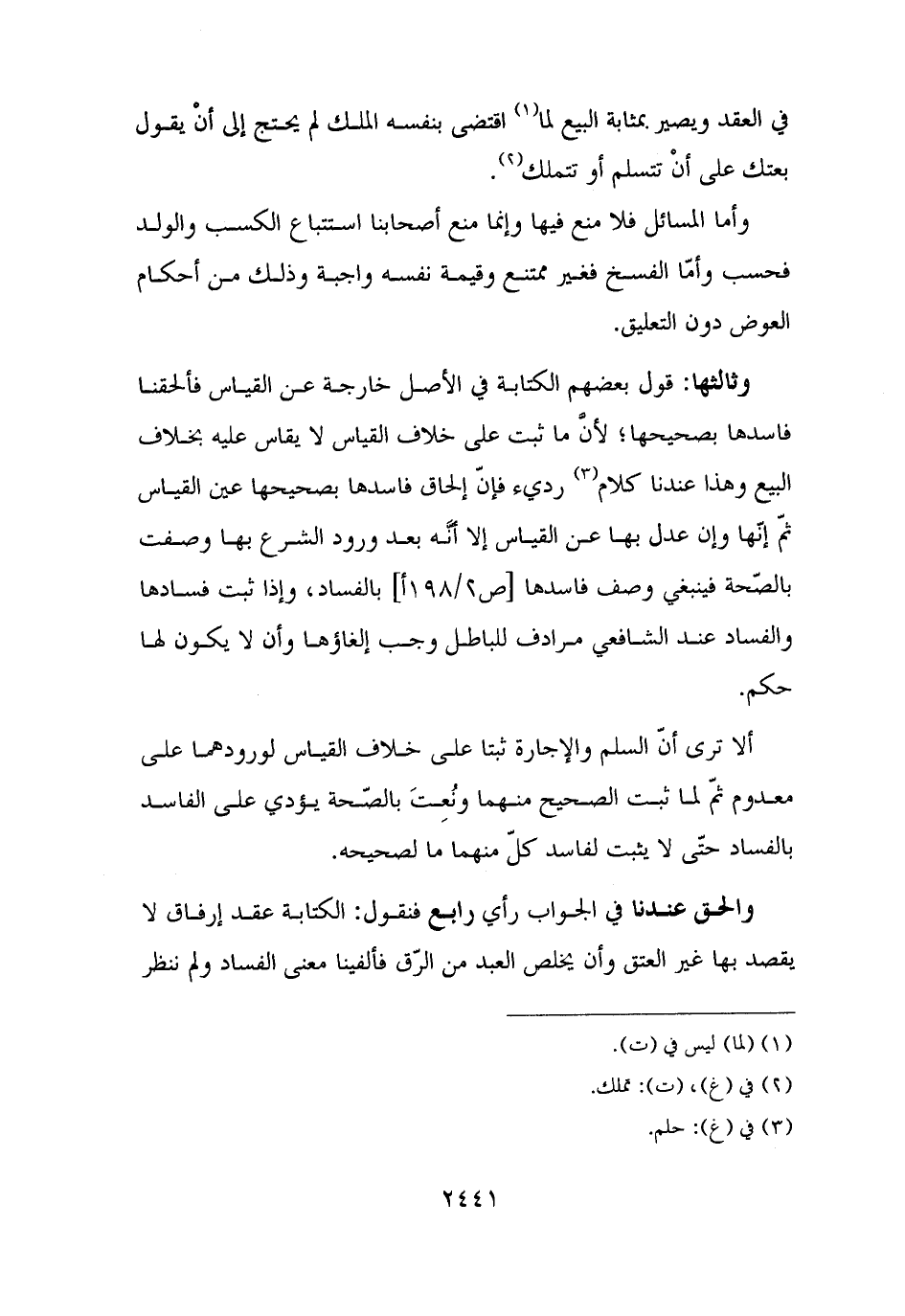 وثالثها: قول بعضهم الكتابة في الأصل خارجة عن القياس فألحقنا فاسدها بصحيحها؛ لأنَّ ما ثبت على خلاف القياس لا يقاس عليه بخلاف البيع وهذا عندنا كلام (¬٣) رديء فإنّ إلحاق فاسدها بصحيحها عين القياس ثمّ إنّها وإن عدل بها عن القياس إلا أنَّه بعد ورود الشرع بها وصفت بالصّحة فينبغي وصف فاسدها بالفساد، وإذا ثبت فسادها والفساد عند الشافعي مرادف للباطل وجب إلغاؤها وأن لا يكون لها حكم.