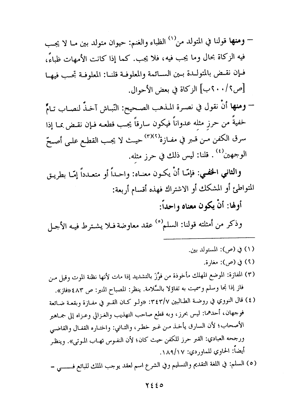 - ومنها أنْ نقول في نصرة المذهب الصحيح: النّباش آخذٌ لنصاب تامٍّ خفيةً من حرزِ مثلِه عدوانًا فيكون سارقًا يجب قطعه فإن نقض بما إذا سرق الكفن من قبر في مفازة (¬٢) (¬٣) حيث لا يجب القطع على أصحّ الوجهين (¬٤). قلنا: ليس ذلك في حرز مثلِه.